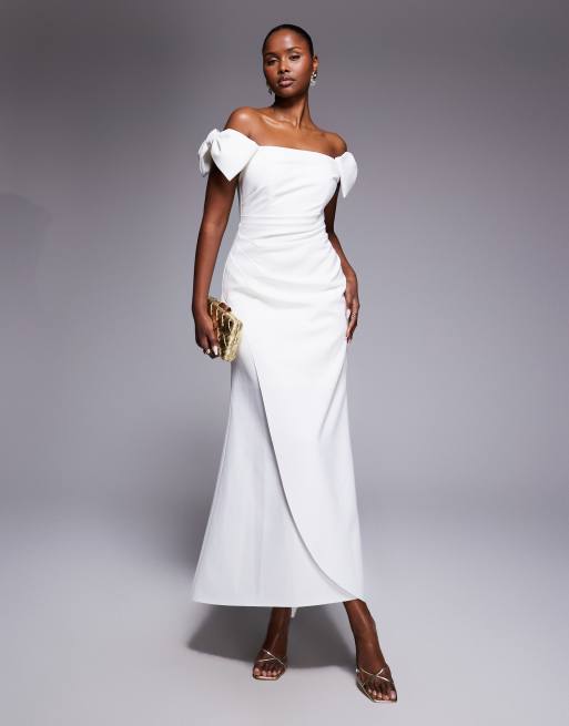 Forever New - Robe de mariée longue à encolure bardot et fronces - Blanc