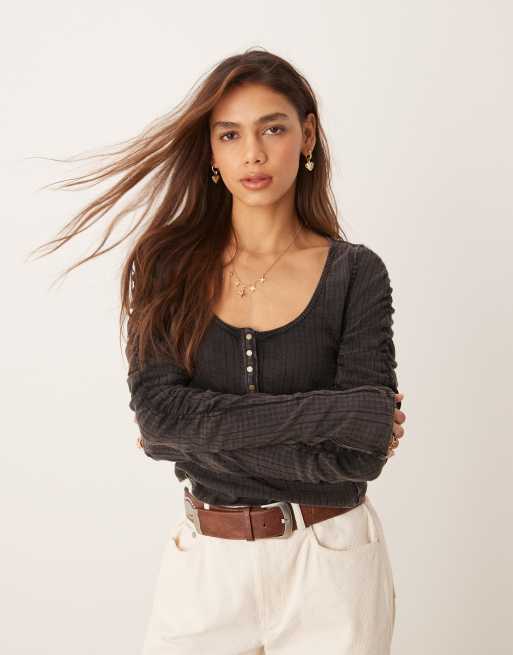 Free People - Top en maille pointelle à manches froncées et col tunisien - Noir délavé