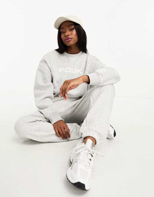 FCUK - Sweat ras de cou d'ensemble à logo - Gris clair chiné et blanc