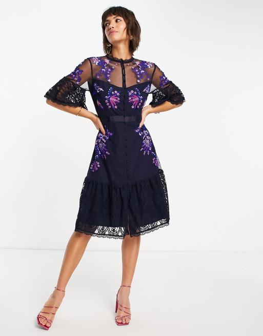 French Connection - Bina - Robe mi-longue brodée à manches volantées - Bleu utilitaire