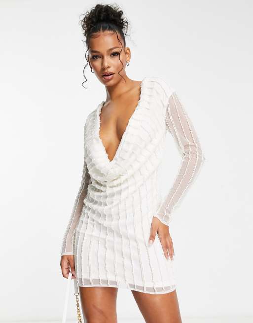 Frock And Frill - Robe de mariée courte drapée à l'avant et ornée de perles fantaisie - Ivoire