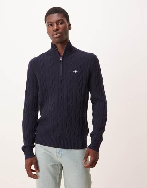 GANT - Pull à col zippé en maille torsadée de laine d'agneau - Bleu marine