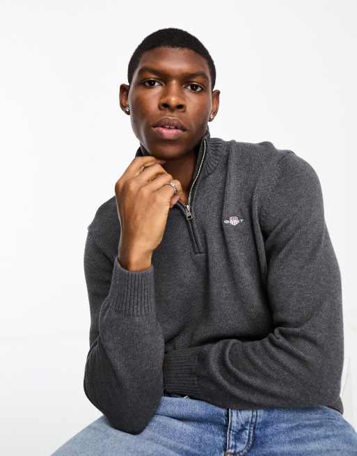 GANT - Pull décontracté en maille de coton à col zippé et logo emblématique - Anthracite chiné
