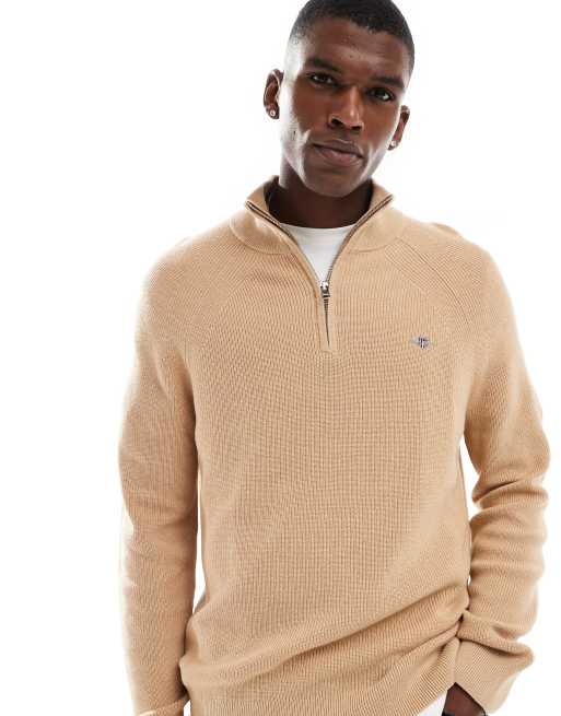 GANT - Pull en maille de coton mélangé à col zippé avec logo - Fauve