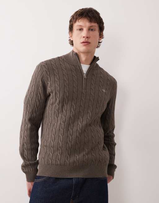 Gant - Pull en maille de coton torsadée à fermeture éclair partielle - Marron