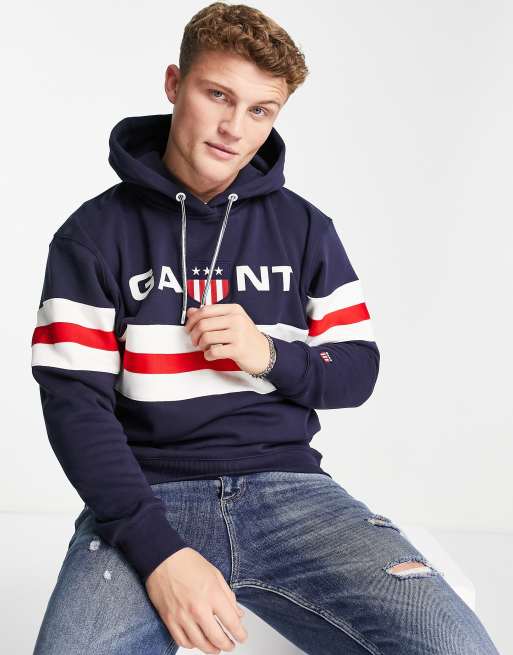 GANT - Sweat à capuche à rayures sur la poitrine avec logo blason rétro - Bleu marine