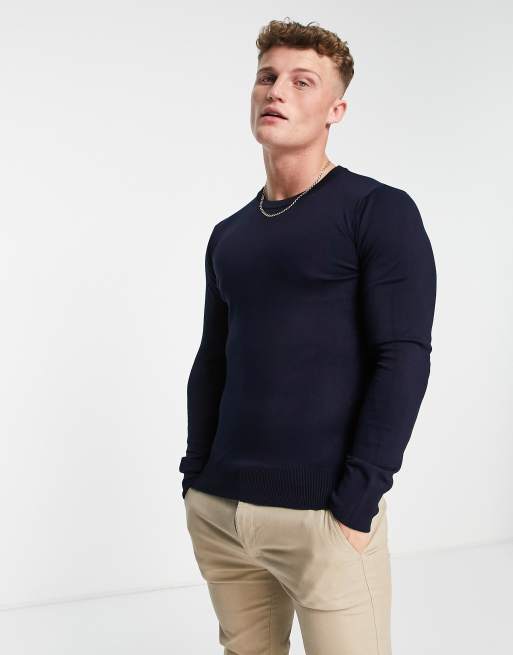 Gianni Feraud - Pull ras de cou moulant en maille fine stretch haut de gamme - Bleu marine