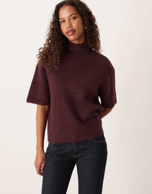 Gina Tricot - Top à manches courtes et col cheminée en laine et alpaga mélangés - Bordeaux foncé