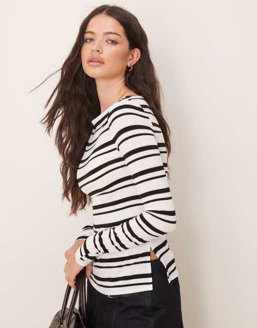 Gina Tricot - Top froncé à rayures avec encolure bateau et fentes sur le côté - Noir
