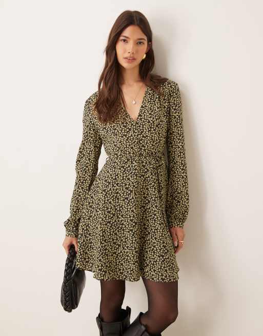 Glamorous - Robe courte à petites fleurs avec manches longues et col en V - Noir et jaune