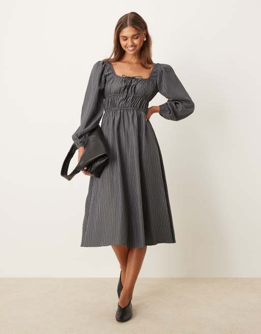 Glamorous - Robe longue froncée nouée devant à manches bouffantes - Gris et noir rayé