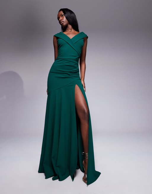 Goddiva - Robe longue fendue sur l'avant en crépon et néoprène avec épaules dénudées - Émeraude