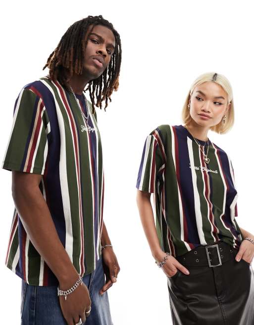 Guess Originals - T-shirt unisexe à rayures verticales - Bleu marine et vert