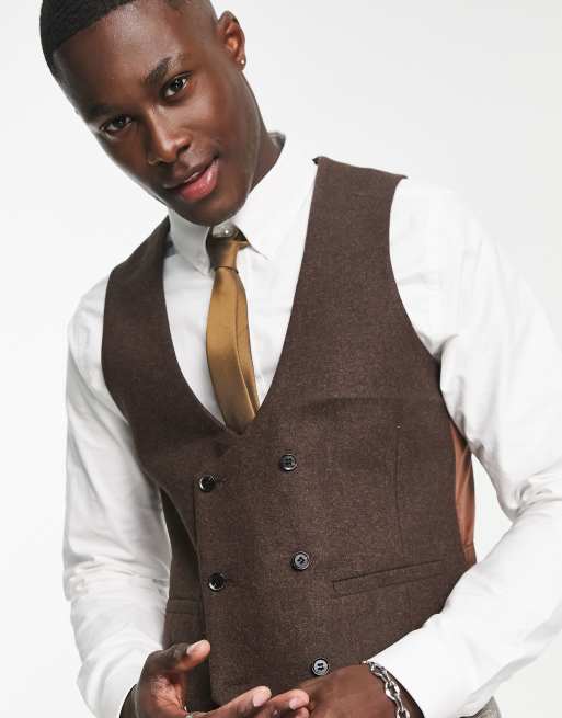 Harry Brown - Gilet de costume de mariage double boutonnage coupe slim en laine mélangée avec revers style châle - Marron tweed