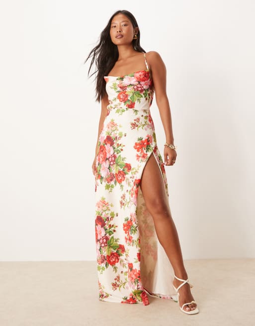 Hope & Ivy Petite - Robe longue à fleurs avec col bénitier, brides croisées au dos et fente sur la cuire - Blanc et rouge
