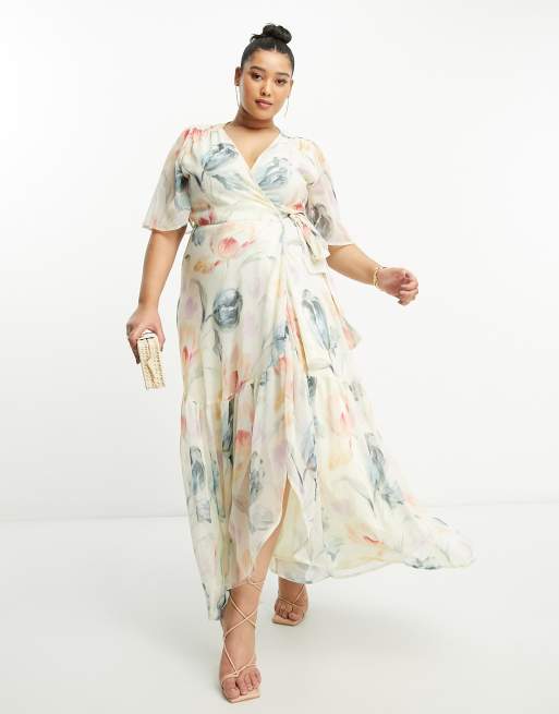 Hope & Ivy Plus - Robe portefeuille longue à fleurs avec manches évasées - Crème