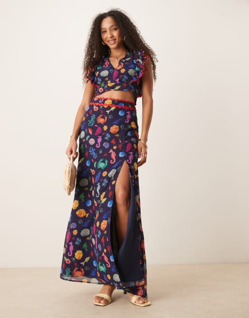 Hope & Ivy - Jupe longue d'ensemble à taille haute avec fente sur la cuisse à motif coquillages - Bleu marine
