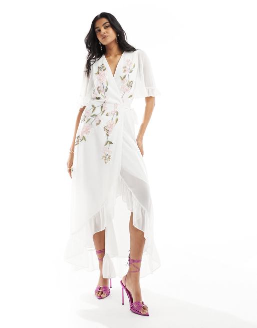 Hope & Ivy - Robe cache-cœur longue brodée à ourlet volanté - Blanc