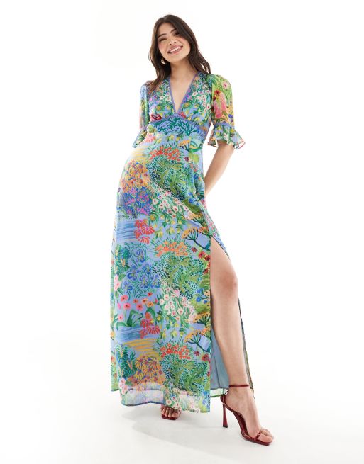 Hope & Ivy - Robe longue à fleurs avec décolleté plongeant et manches évasées - Bleu