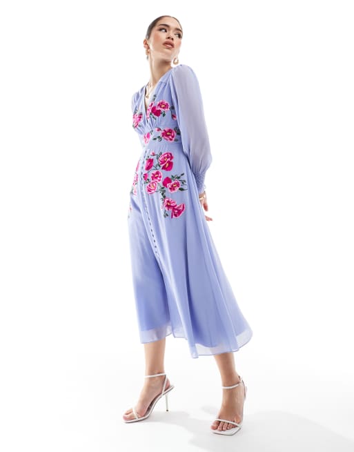 Hope & Ivy - Robe mi-longue boutonnée à manches longues et broderies - Lilas
