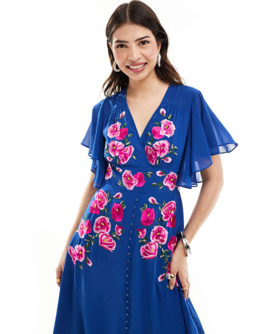 Hope & Ivy - Robe mi-longue brodée à manches fluides - Bleu
