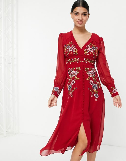 Hope & Ivy - Robe rétro mi-longue à manches longues et broderies - Rouge