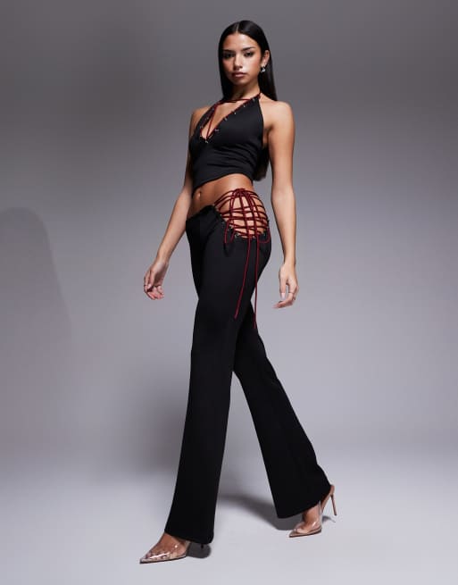 I.AM.GIA - Onyx - Pantalon évasé d'ensemble à taille basse avec œillets et lacets - Noir et rouge