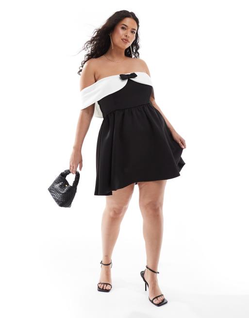 In The Style Plus - Exclusivité - Robe courte à encolure Bardot avec nœud devant - Noir et blanc