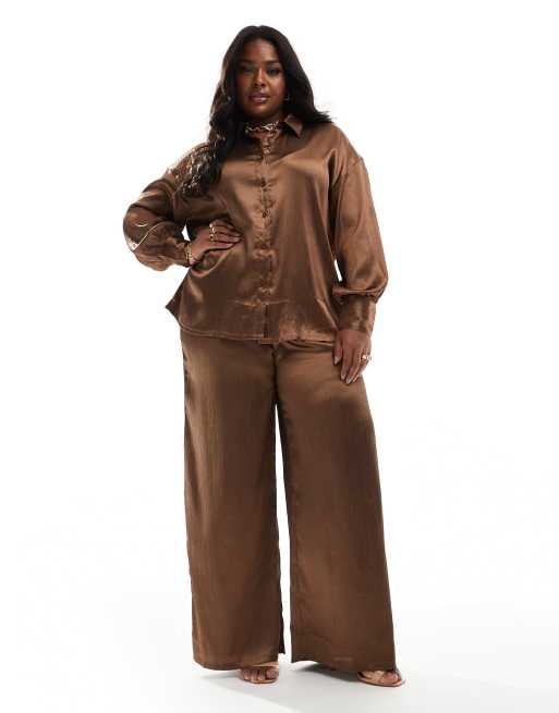 In The Style Plus - Pantalon d'ensemble satiné - Moka