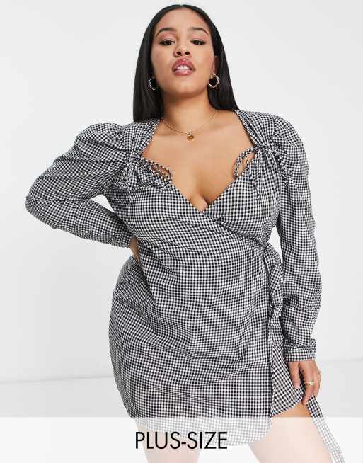 In The Style Plus x Perrie Sian - Robe courte asymétrique nouée sur le côté à épaules bouffantes et imprimé vichy