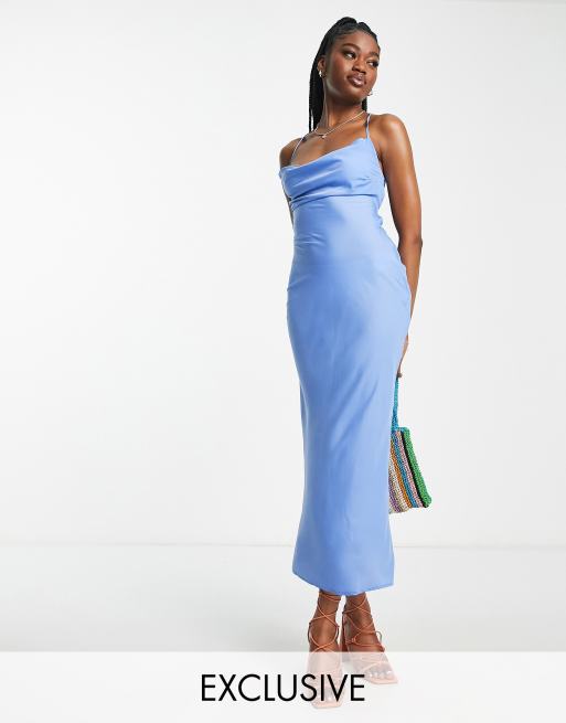 In The Style - Exclusivité - Robe mi-longue en satin à col bénitier - Bleu clair