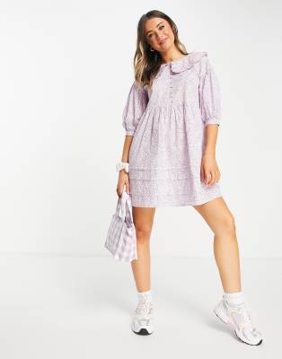 Influence - Robe courte à col Claudine - Lilas fleuri