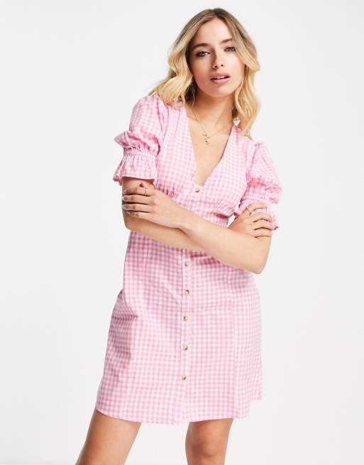 Influence - Robe courte boutonnée à manches bouffantes et carreaux vichy - Rose