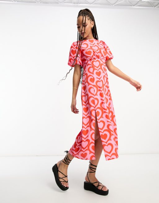 Influence - Robe mi-longue à manches bouffantes et imprimé cœurs - Rouge et rose