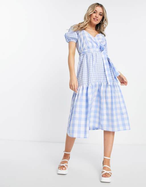 Influence - Robe mi-longue à volants et manches bouffantes avec motif à carreaux - Bleu