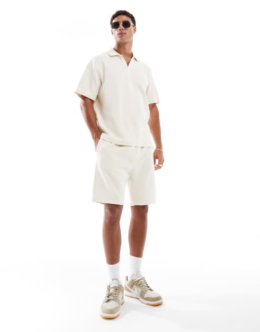 Jack & Jones - Ensemble texturé avec polo à col ouvert et short - Blanc cassé