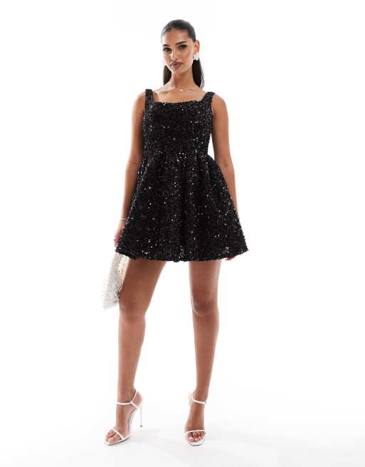 Jarlo - Robe courte trapèze à sequins et encolure carrée - Noir