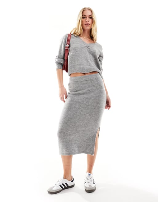 JDY - Pull col en V et jupe en maille - Gris