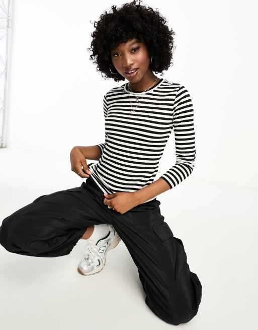 JDY - Top côtelé rayé à manches longues - Noir et blanc