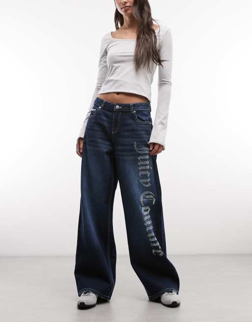 Juicy Couture - Jean ample taille mi-haute à strass - Bleu moyen délavé