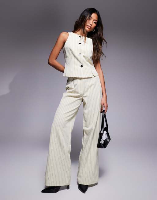 Exclusivité - Kaiia - Ensemble gilet de costume ajusté et pantalon évasé - Crème à fines rayures