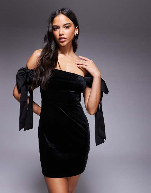 Exclusivité - Kaiia - Robe courte en velours avec épaules dénudées et nœuds oversize - Noir