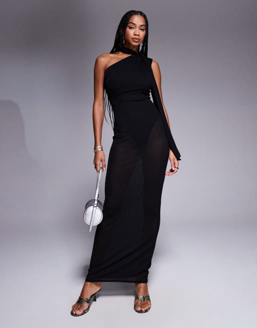 Exclusivité - Kaiia - Robe longue asymétrique en tulle avec détails transparents et foulard - Noir