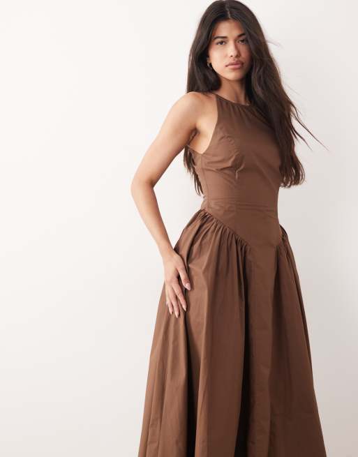 Exclusivité - Kaiia - Robe longue dos nageur en popeline de coton froncée à la taille - Marron