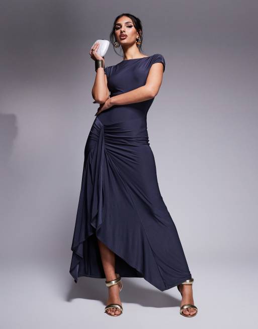 Exclusivité - Kaiia - Robe longue double épaisseur effet drapé avec fente latérale et mancherons - Anthracite
