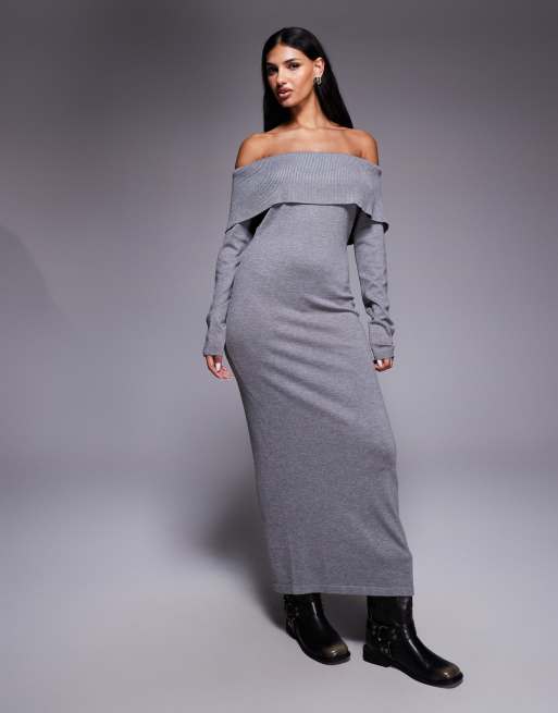 Exclusivité - Kaiia - Robe longue en maille souple avec encolure bardot rabattue - Gris