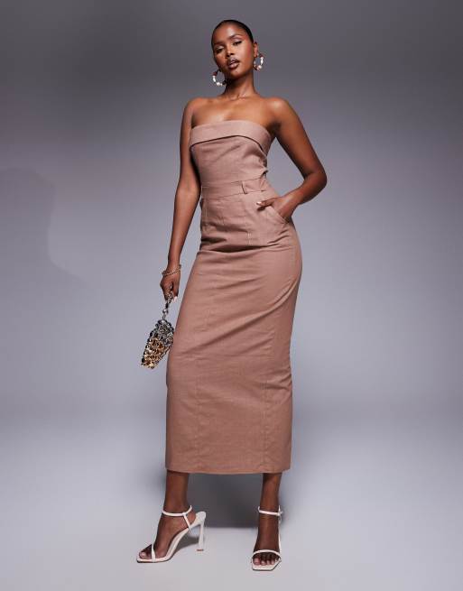 Exclusivité - Kaiia - Robe longue et ajustée en lin avec fente au dos et encolure bandeau rabattue - Marron