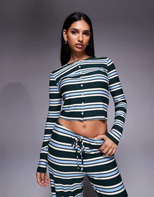 Exclusivité - Kaiia - Top d'ensemble boutonné en jersey ultra-doux rayé à manches longues - Vert et bleu pastel
