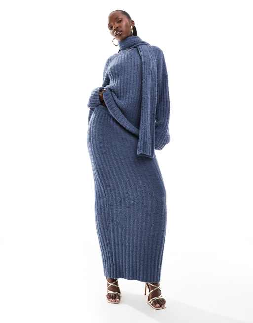 Kaiia - Ensemble en maille côtelée avec jupe longue et pull oversize façon écharpe - Bleu marine