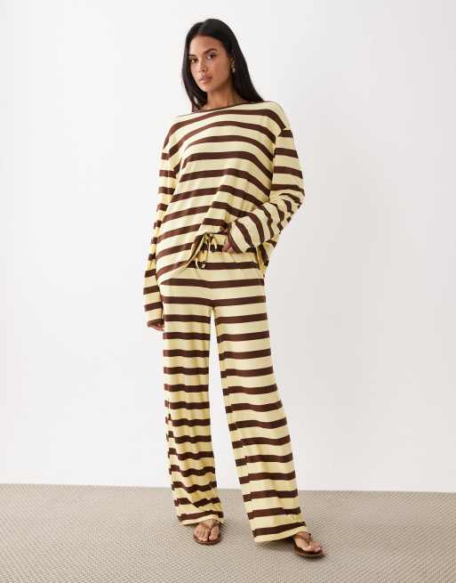 Kaiia - Pantalon rayé d'ensemble en jersey ultra-doux à cordon de serrage - Citron et chocolat